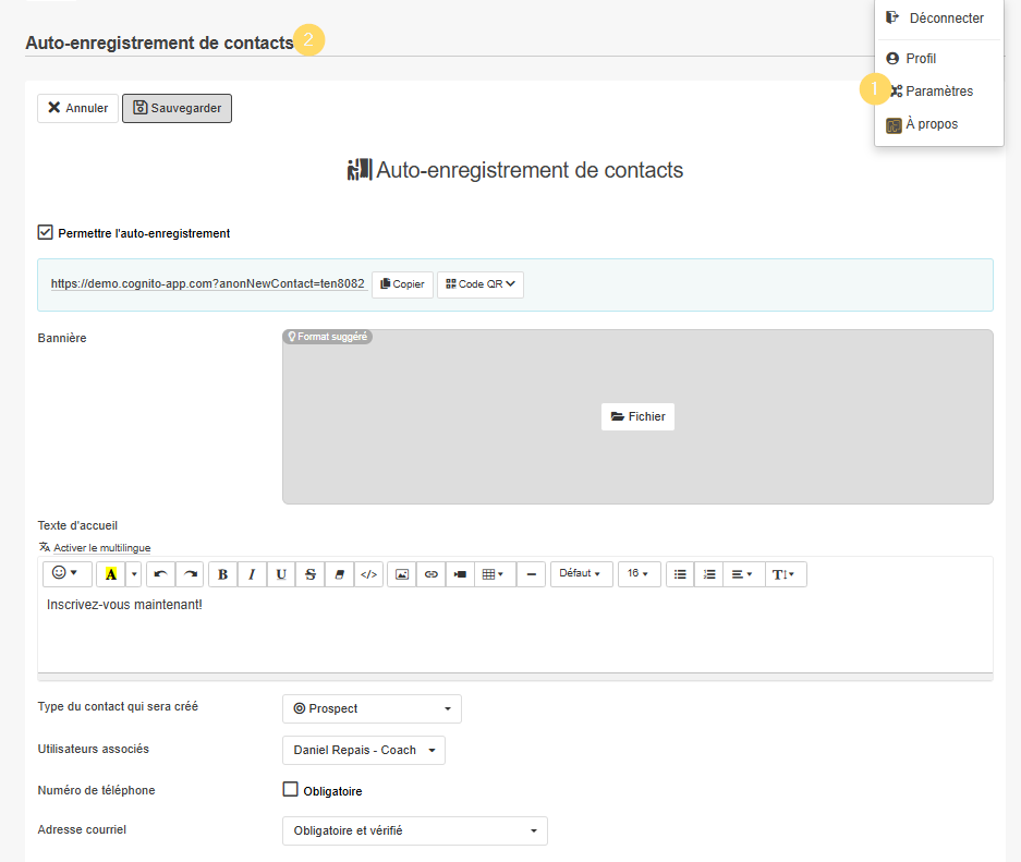 Cas d’usage : Vous organisez un événement, un webinaire ou un atelier. Vos participants peuvent désormais s’enregistrer automatiquement comme nouveaux contacts dans votre base de données Cognito Coach.